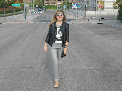 Me resulta muy cómoda la combinación jeans + camiseta + cazadora (+ blazer, + punto, + trench...+ lo que sea...). Hoy me apetecía darle un cierto aire "rockero" a mi aspecto, echando mano de "fondo de armario" para arropar una camiseta de Mango de nueva temporada. Así, sin más (porque luego las críticas de mi "teenager" particular son demoledoras).