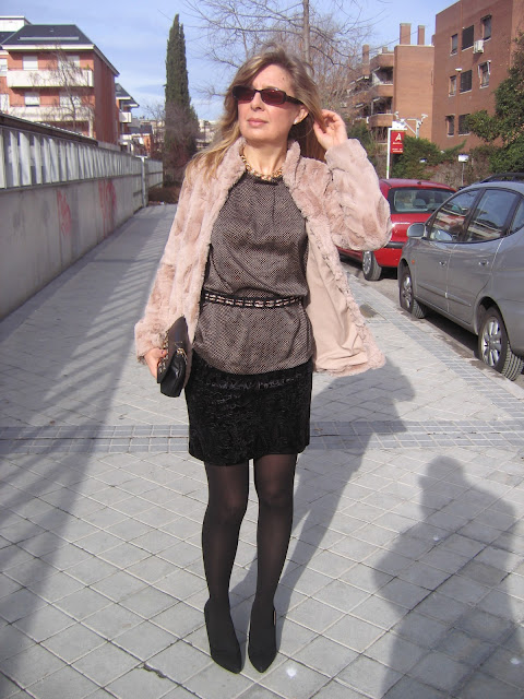 Faux Fur Coat: ZARA (AW12/13) / Top satén: TRUCCO (AW12/13) / Falda terciopelo: TRUCCO (AW12/13) / Cinturón ante: MANGO (AW11/12) / Collar: MANGO (AW12/13) / Clutch: ROBERTO VERINO (AW12/13) /Medias: WOLFORD / Zapatos ante: MANGO (AW12/13) / Anillo: UTERQÜE / Gafas: E.C.I.