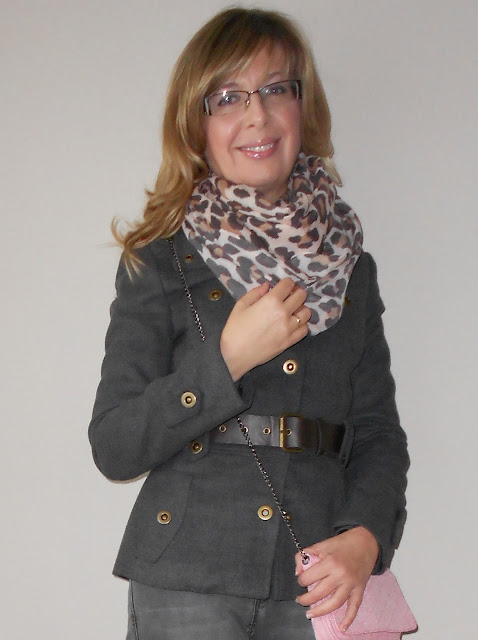 En esta ocasión, he optado por la chaqueta militar y un "leopardo" al cuello, eso sí, en dos de mis colores "fetiche", gris y rosa "empolvado", o "nude"..., etc, rompiendo un poquito el tándem con el marrón chocolate (otro de mis "fijos"; será por mi "adicción" al comestible...ja...ja...!).